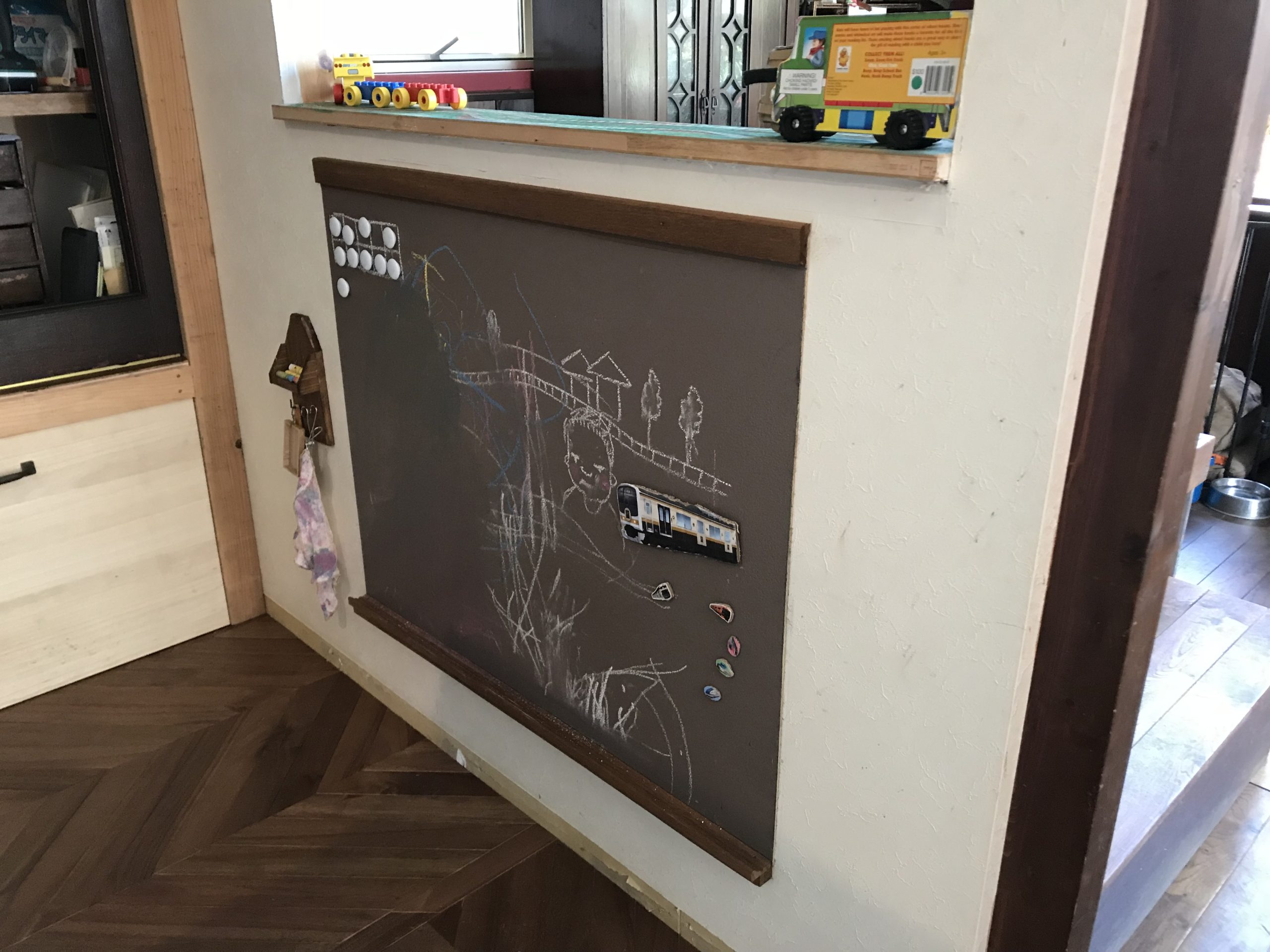 食器棚記事を更新していますが、ちょっとここで一息。前回の記事でチビの落書きについて書いたので夏に作った黒板コーナーを書きますもうチマタには沢山の黒板記事が載っているので作業は省きます用意したのはこんな...