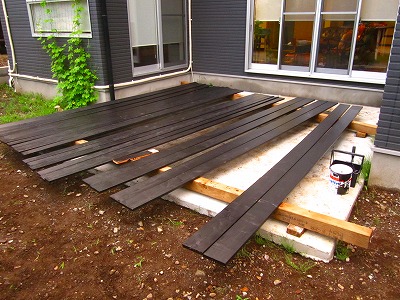 ウッドフェンスの塗装をお盆休みに間に合わせるべく頑張っています。