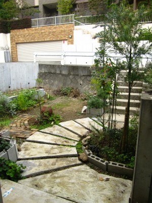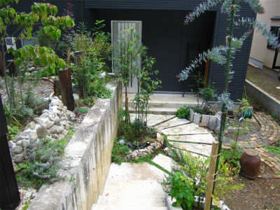 階段を下りた玄関アプローチです。