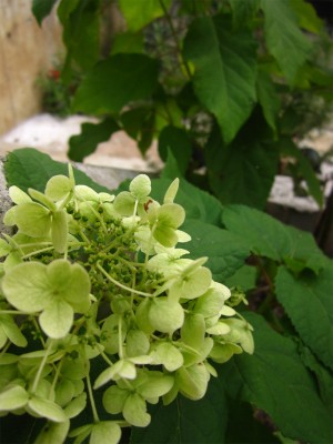ウチの鉢のアナベルは台風で揺さぶられ、