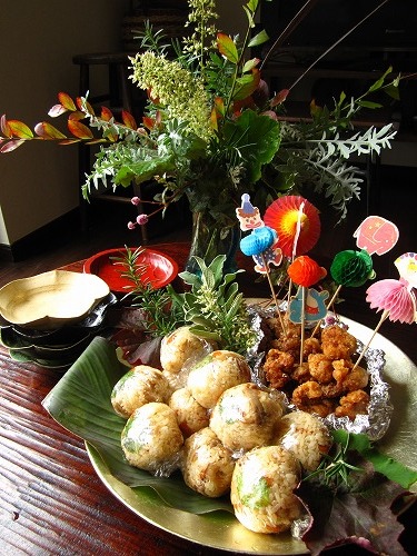 持ち寄った料理に我が家の草花を散りばめて楽しみます。