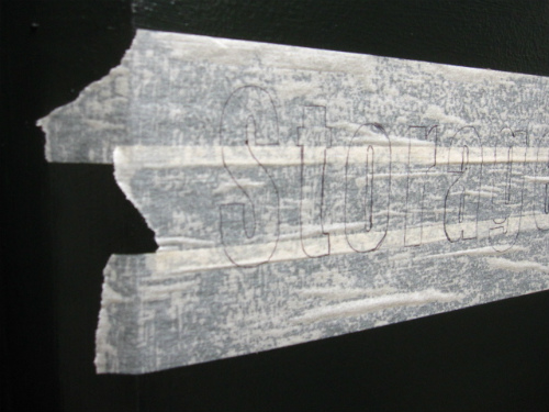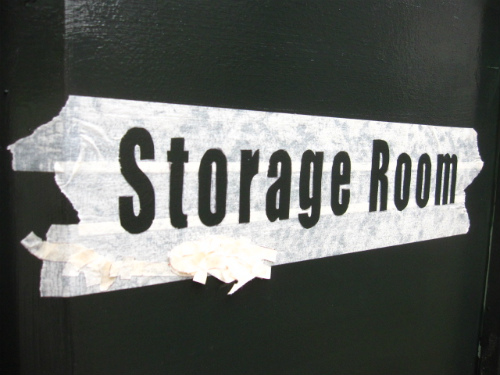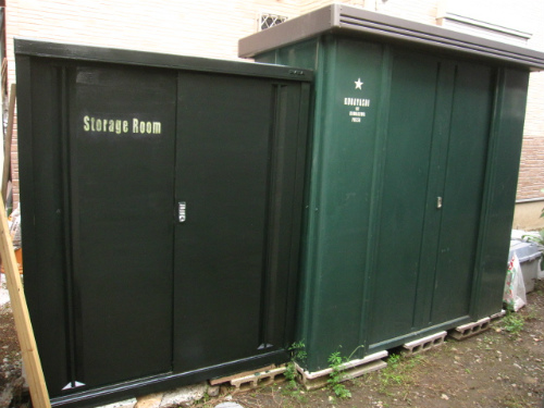 北側の小道9 物置2 北小道 2012.06.132014.01.09 塗装し終わって早々に ステンシル Storage Room 物置という意味ですね 余っているクリームペンキをスポンジでトントンして その上からオリーブ色と黒で適当に着色 ではビファー&アフター うんうん、よしよしw