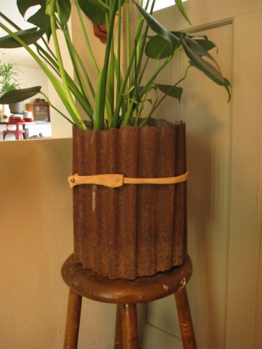 トタンとレザーの鉢カバーです。