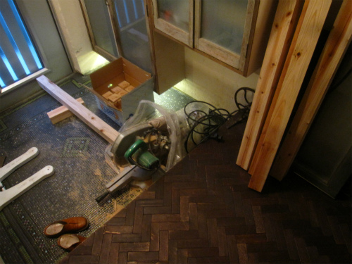玄関にスライドノコギリを出して