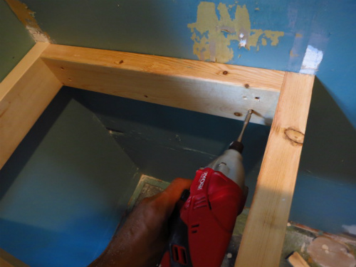 間柱位置にビスを打ちこみ固定。