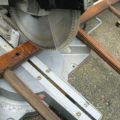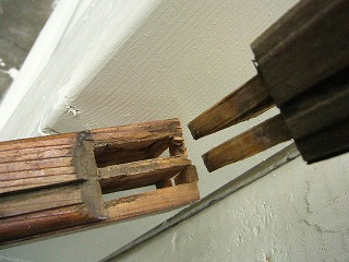 風除室 窓枠 ② 風除室 2008.06.12 建具が傷つかないように、木を添えて、金槌で叩いて枠をバラして行きます。 時々、自分の足を叩いてしまう事があって、一人悶絶してる時がよくあるの で、気を付けないと・・・。 枠が外れると、こんな感じでホゾ組みが出てきます・・・。