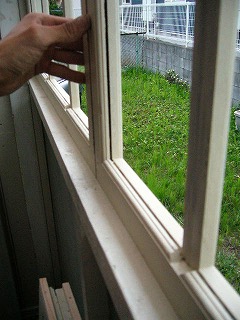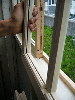 窓枠の取り付け方は・・・まず、上側の溝に建具を差し込んで・・・・、