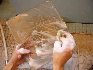 ガラスは洗剤で。