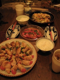 今晩の夕食は、肉のトマト巻きとアボカド巻きに、ゴ-ヤチャンプルです。