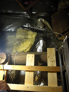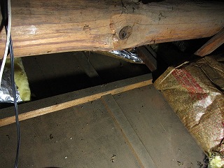 天井裏の断熱材をどかすと、天井裏のベニヤが出てきました。