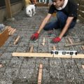 勾配をみながらレベルを砂利で調整して