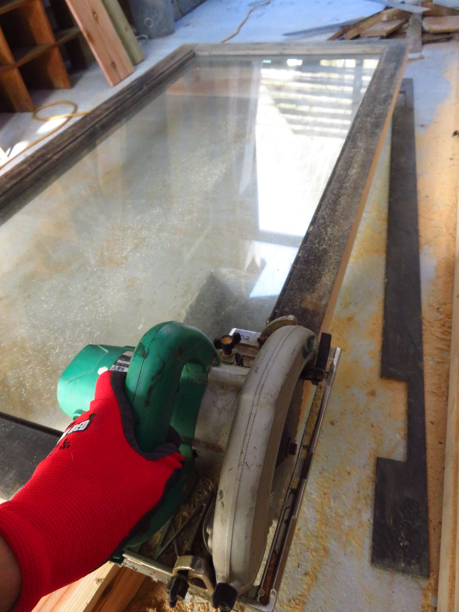 窓枠自体が斜めに作られていた為、丸ノコで直線にカットします。