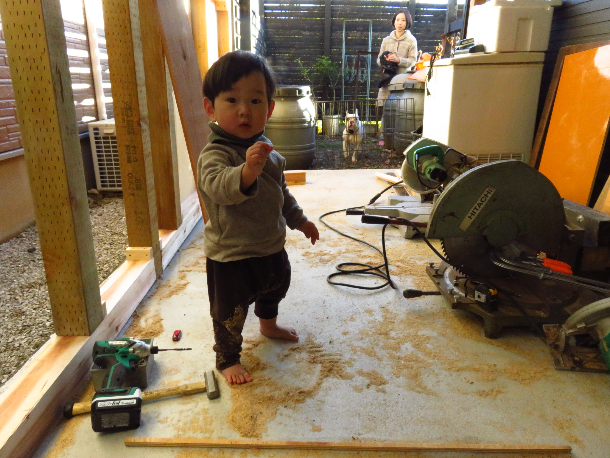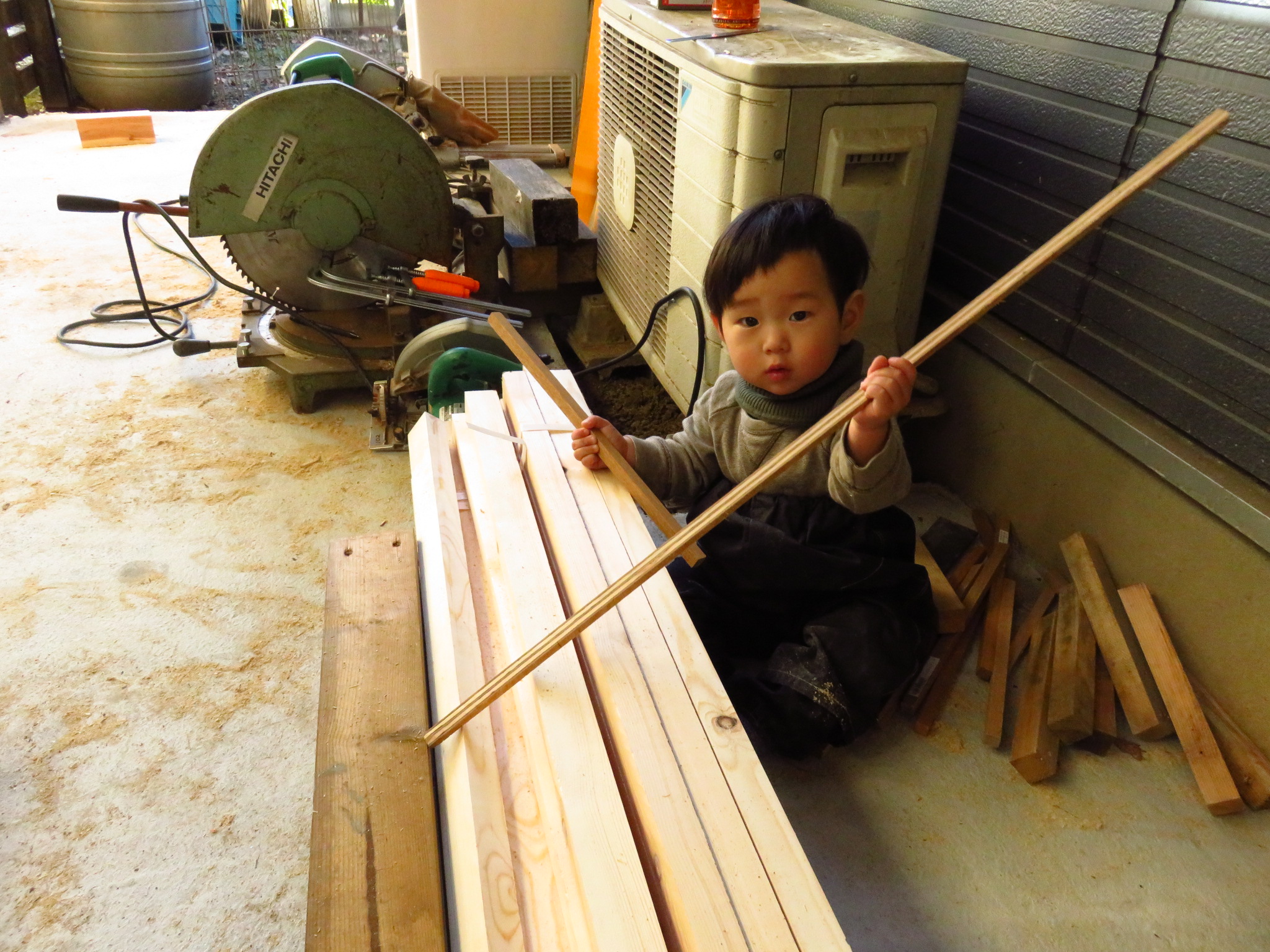 作業中、そんな息子はというと、側で木材を移動したり、木くずを集めて遊んだりと
