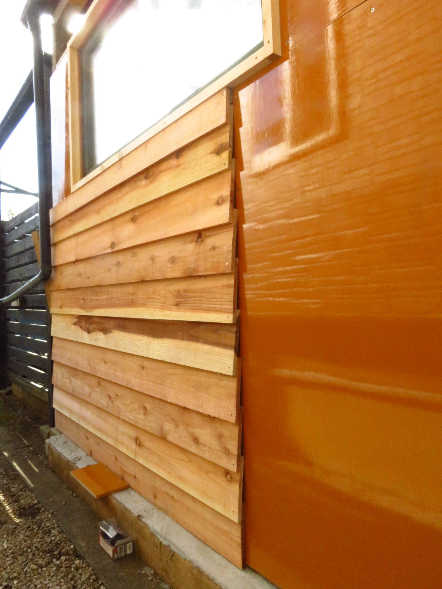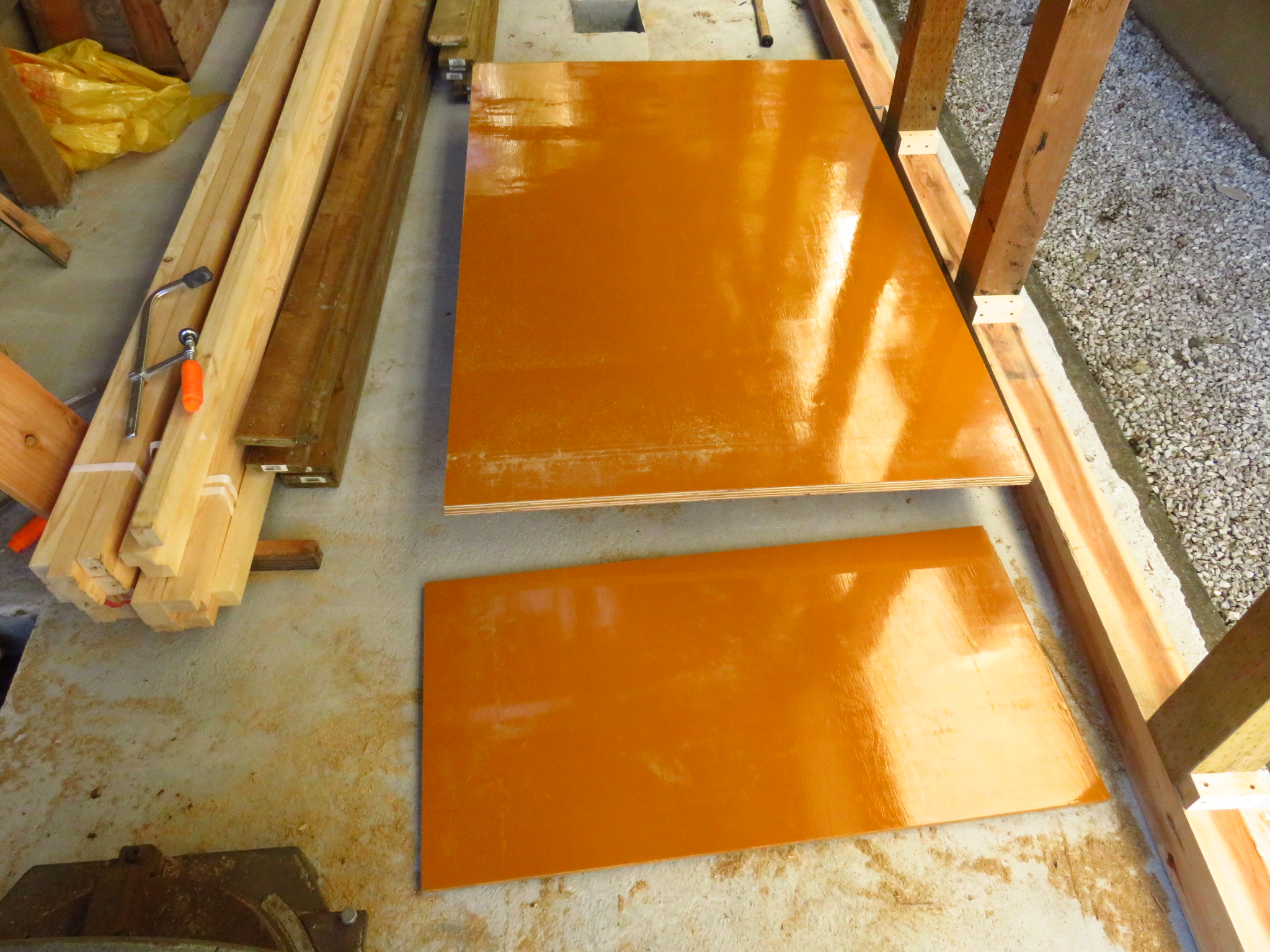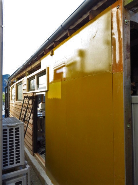 通常は【ベニヤ】+【防水シート】+【壁材】の順番に貼っていくトコですが、今回は防水面を↓このコンパネで代用しました。