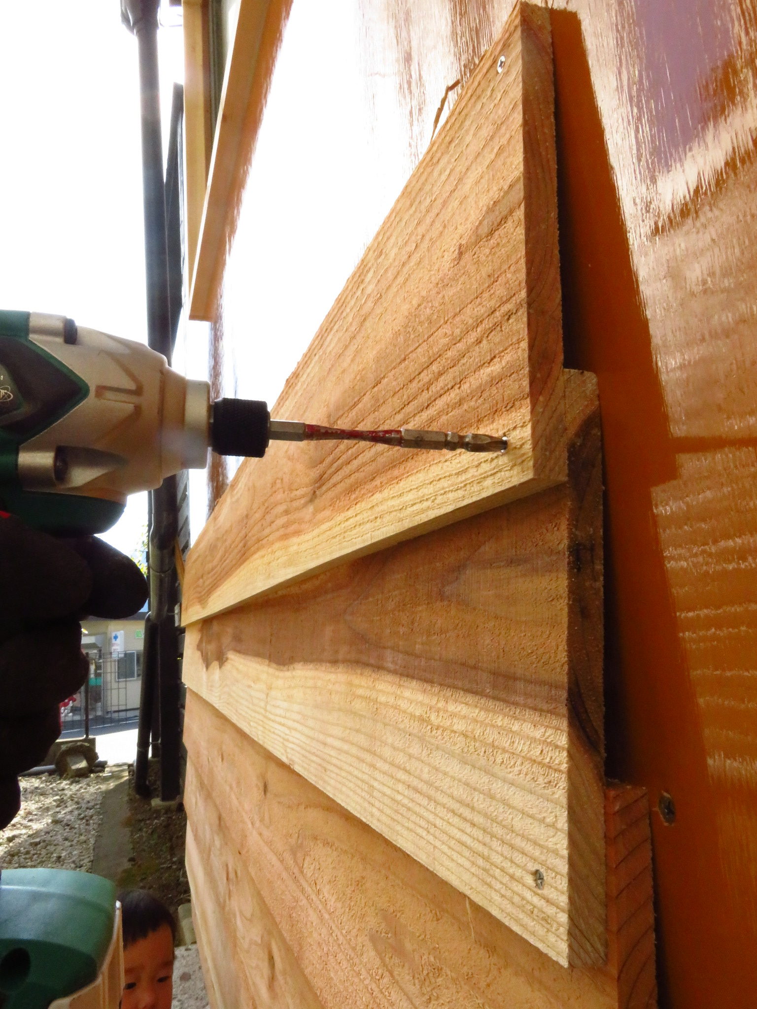 壁材の杉板を重ねながらビスで固定して行きます。
