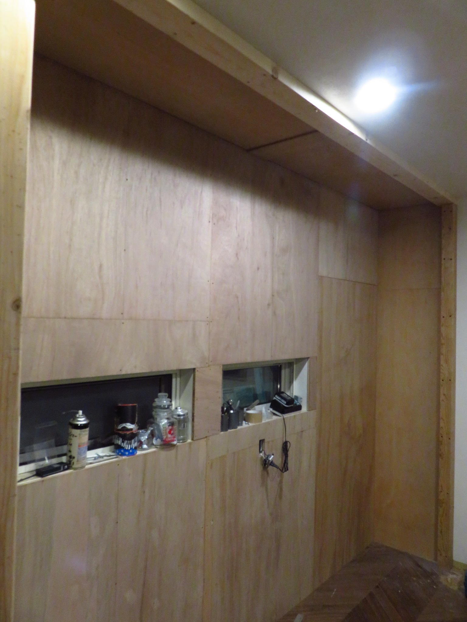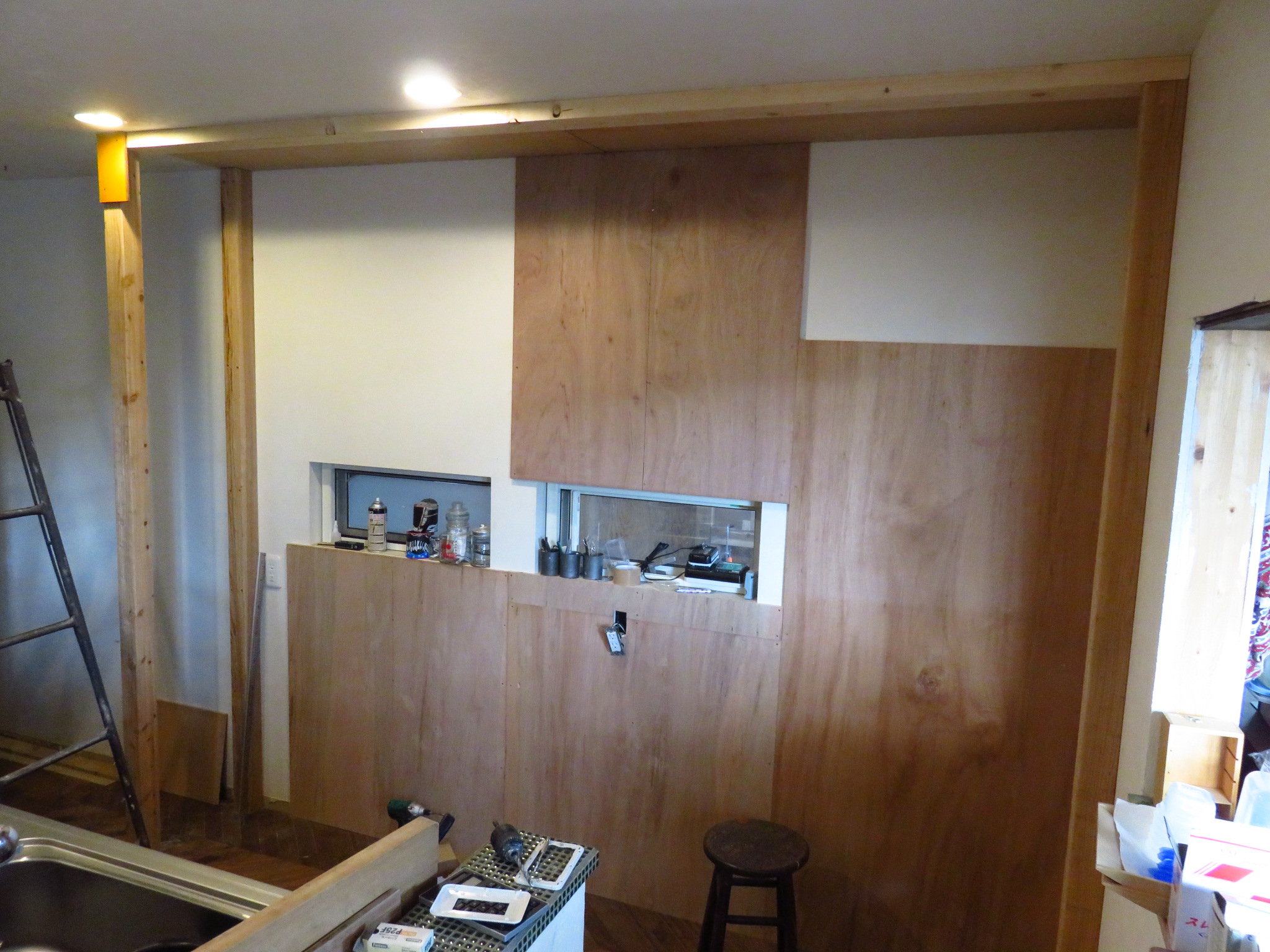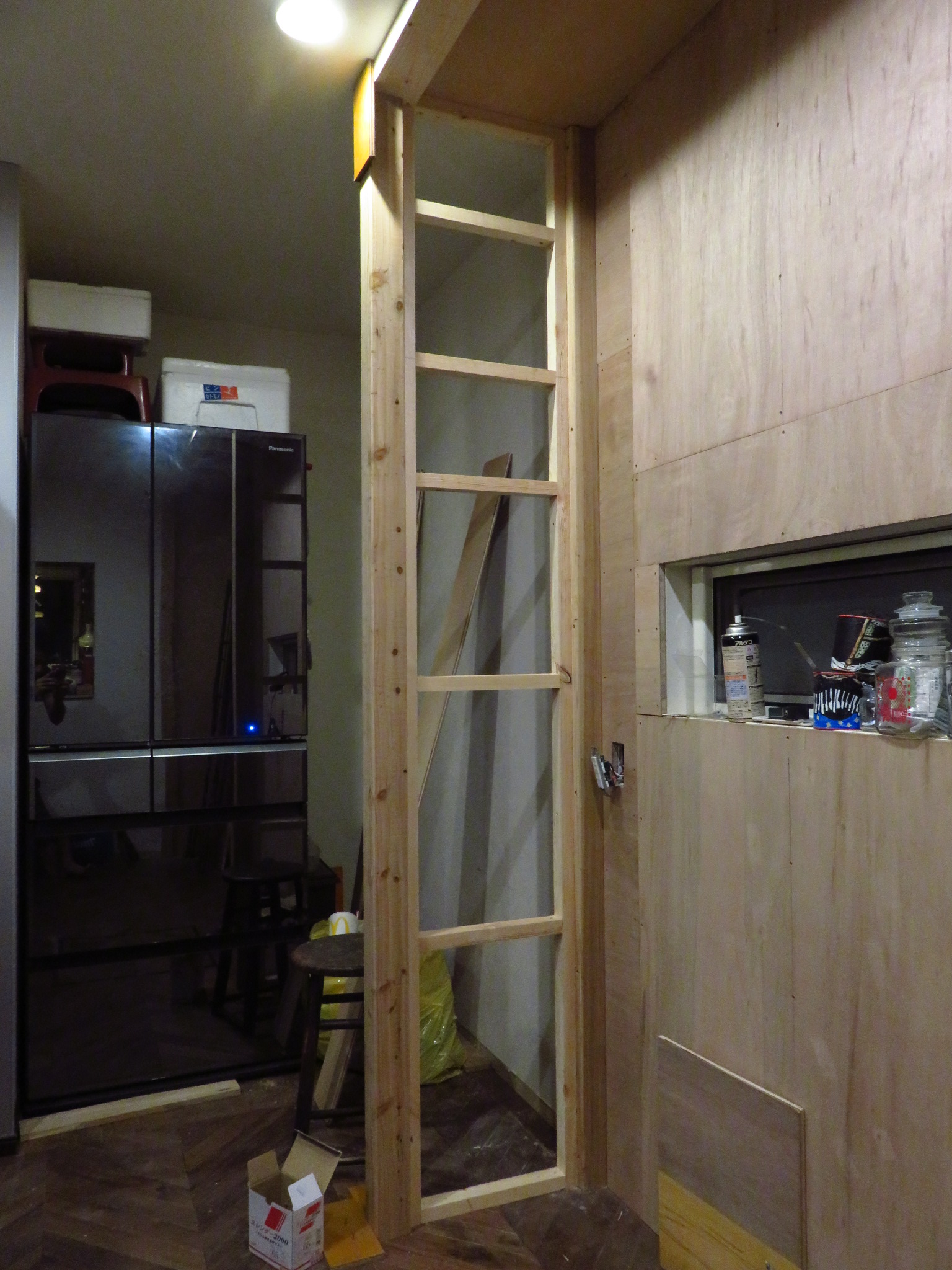 壁面に可動レールを取り付けた食器棚にするので強度が必要。