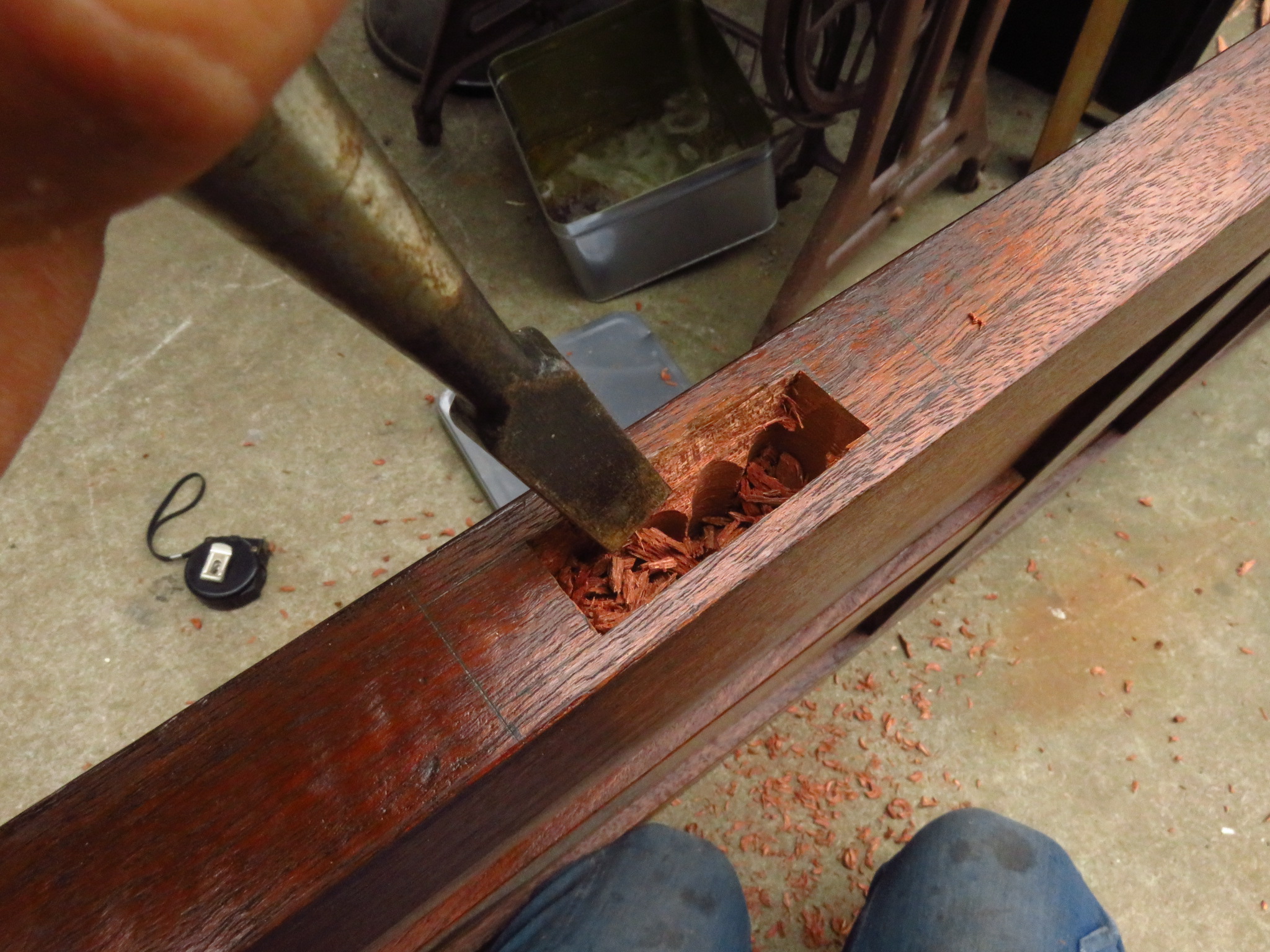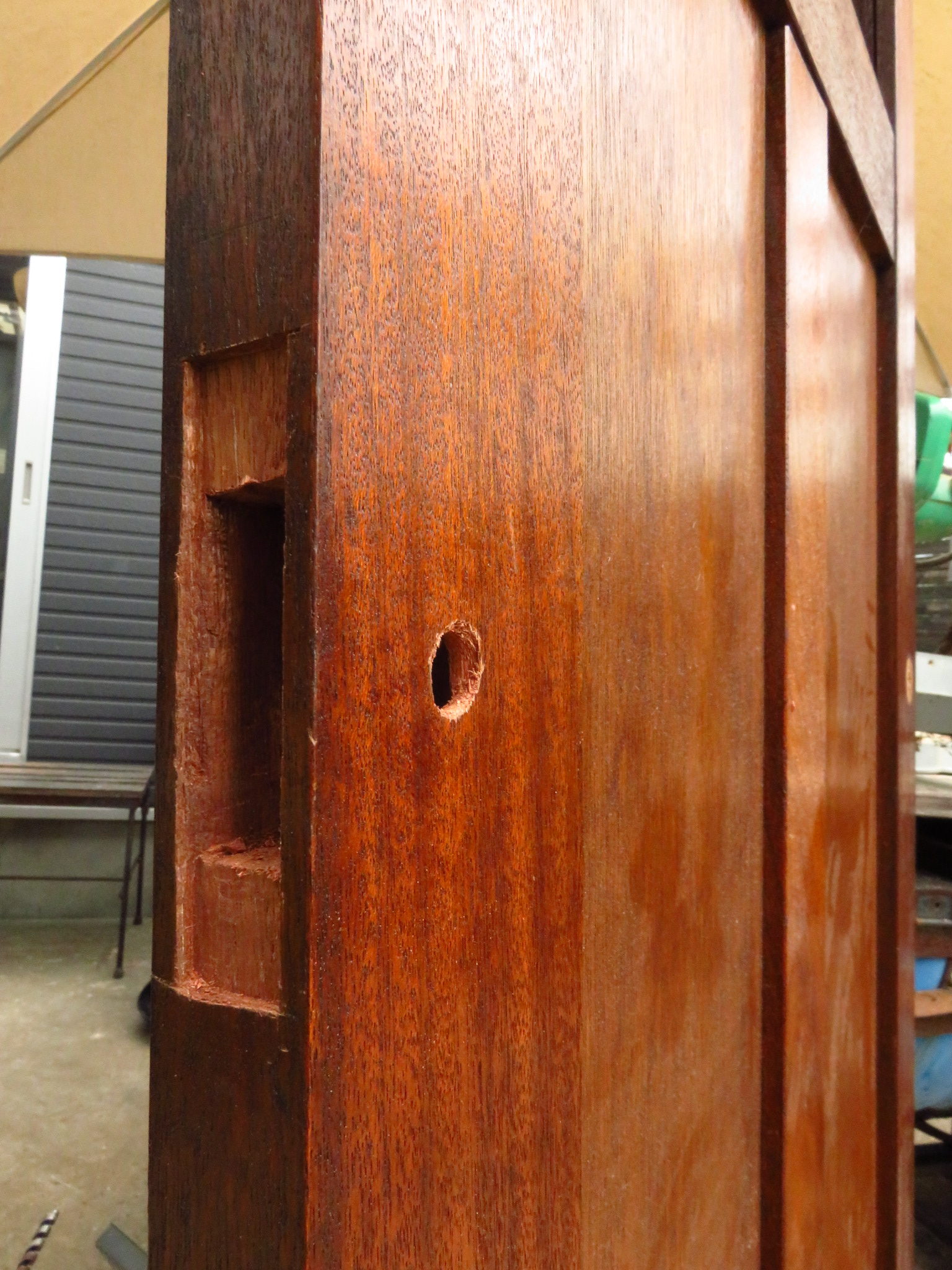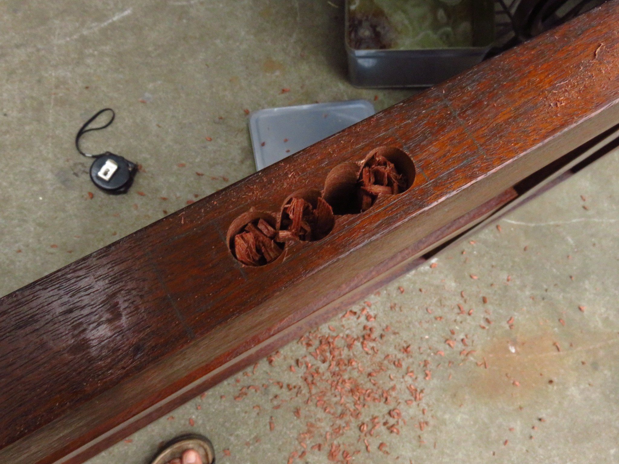 鉛筆で薄く線が引いてあるラインが、金具収納位置になるので、このライン分を削り穴を開けて行きます。