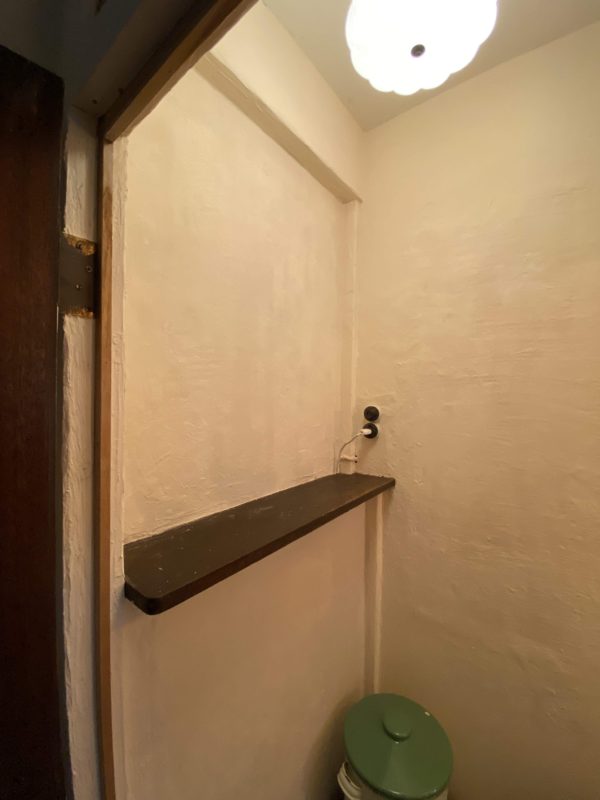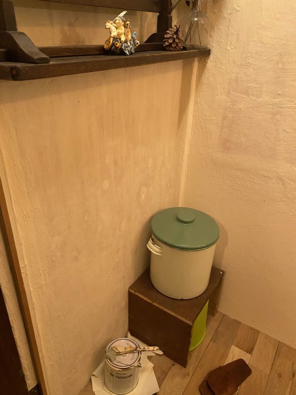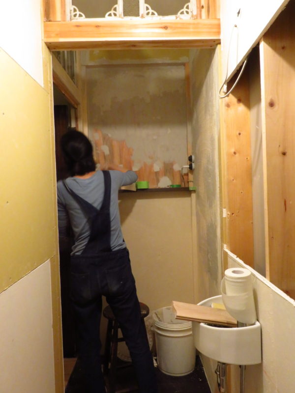 トイレ奥の塗りかけの壁を漆喰で塗ります