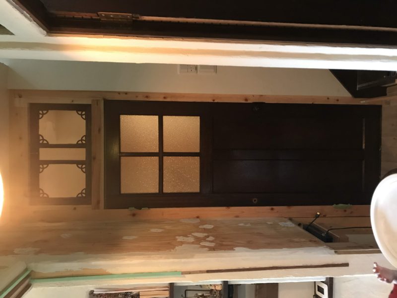 既存のリクシルドアを枠も含め撤去しアンティークドア設置